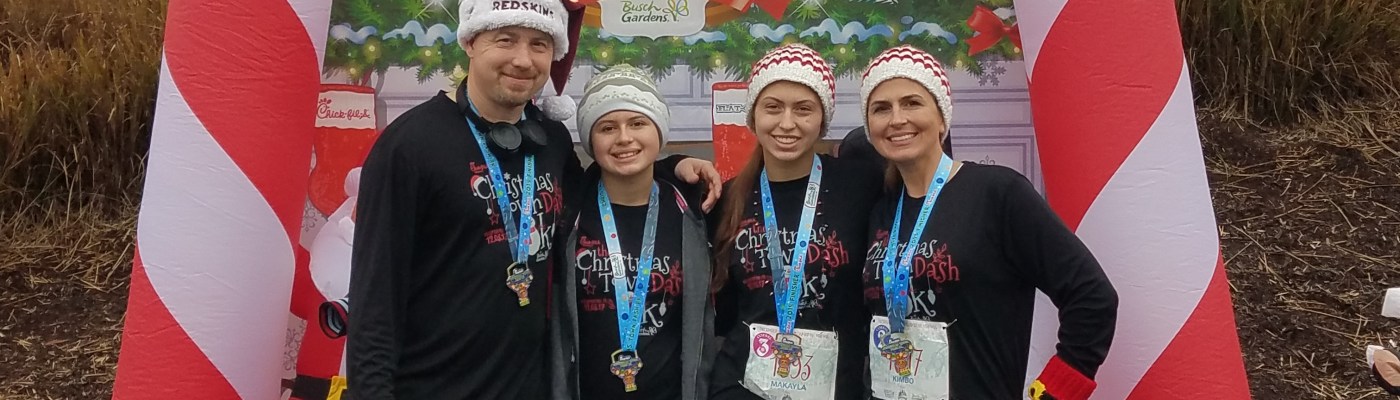 I love this race and hope to continue racing it every year. The race swag alone is worth the cost of registration (reduced price ticket to Christmas Town, FREE ticket to Busch Gardens for the following spring, race t-shirt, and race medal for each participant). As a bonus, I was finally able to fulfill my wish of the family wearing matching PJs on Christmas morning because we used our race shirts 🙂