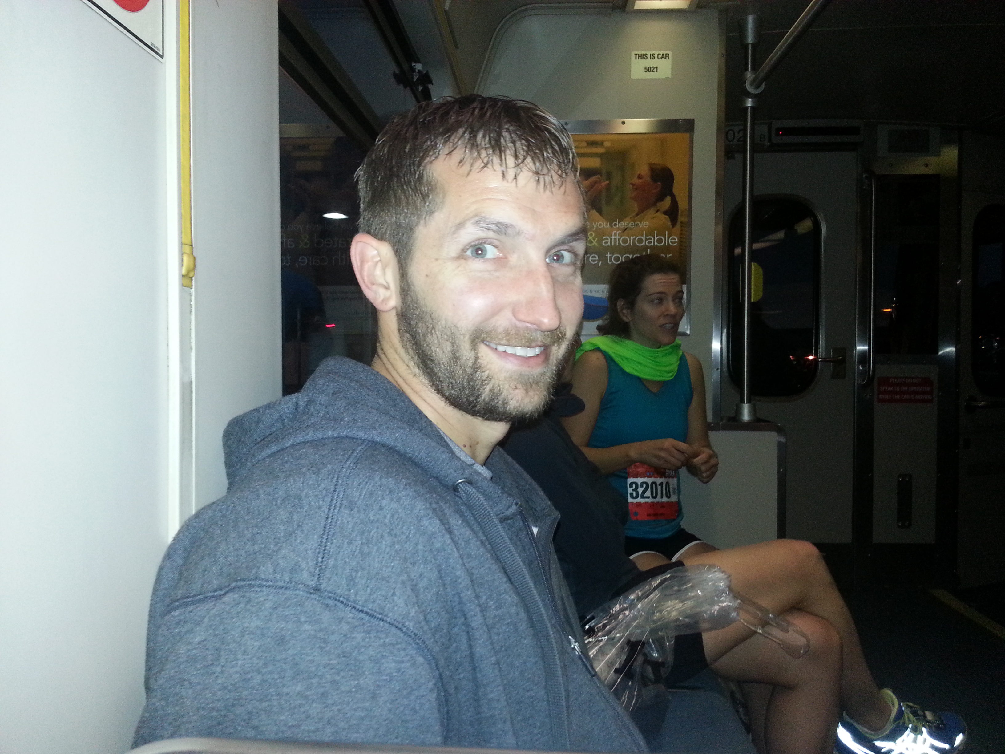 RACE DAY – The alarm went off at 4:20. I set my alarm ringtone to the Goonies, thinking it would excite me. Yeah, that didn’t really work like I intended it to. But we did get up and get ourselves together. Sam showed up just before 5:00. After gathering all our stuff we were on the road by a little after 5:00. Sam decided to follow behind us so that he could leave quickly after the race was finished. We had decided to take the light rail because I had heard traffic would be a nightmare on race morning. We had never used the light rail, but it was very easy to navigate and before we knew it, we were on our way (we never did scan our passes or even have anyone ask for them…hmmmm). Steven and I shared a pb&J sandwich on the bus and followed it up with my bag of nuts.