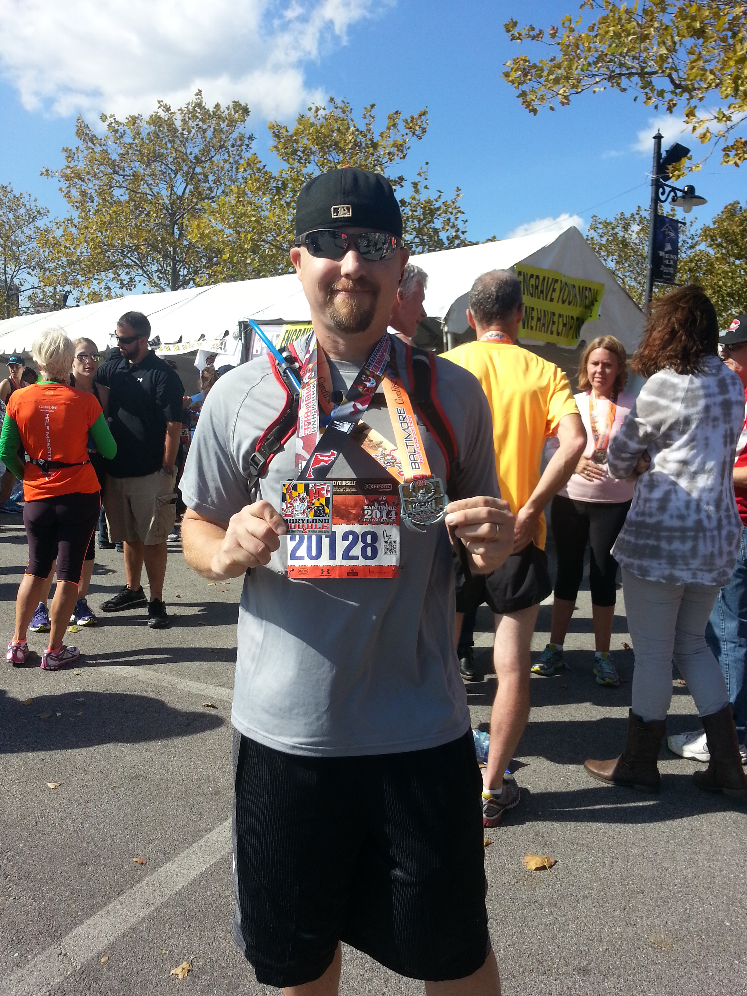 We left the finishing area to find our Marlyand Doubler medal (for completing both Frederick and Baltimore half marathons) and we collected our free beer. I try to drink my beer, but always end up giving most of it to Steven.