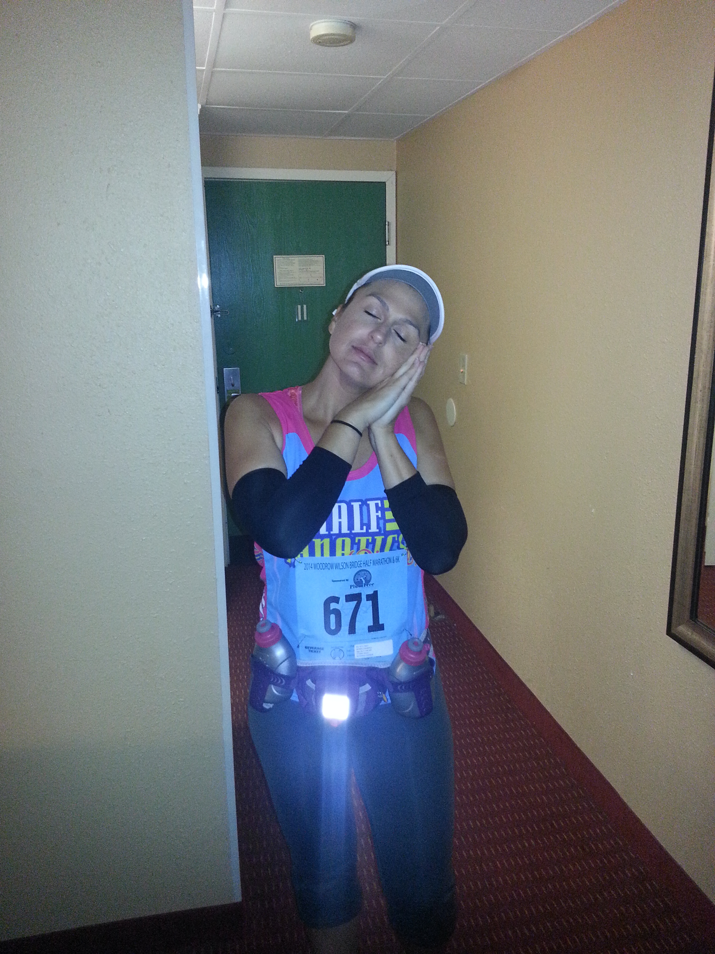 It was at this point that I realized I forgot my nice camera that I wanted Steven to use for the finish line. Oops. I lay down around 9:30 and was actually REALLY tired. At this point, I thought I was genius for getting up early that morning to ensure I’d be extra tired that night. I set my alarm for 4:20 and went to lala land relatively easily. Until about 11:30 when I woke up to the sound of a car alarm. UGHHH. What a horrible noise. So, I think it will go off soon…only it doesn’t. The alarm continues to go off. It would go off for 10-15 minutes and then stop for 10-15 minutes and start again (overly sensitive alarm that went off due to traffic and wind, I assume). Steven went to the desk to complain and they said they would call the police. They told him that sometimes people park their cars there to go out for the night. THE ALARM DIDN’T STOP!! I went to the front desk at 1:40 to complain again. They said the police had come and the owner was not a registered guest so there was nothing they could do. They offered to move me, but I knew that was pointless since other guests on the 3rd floor were also complaining. I was basically dismissed because they were dealing with “another bigger problem with an elderly lady”. The alarm finally stopped (I like to think that it was the result of my talk with the front desk staff, however in all honestly, I think the car battery finally died). So at that point I was wide awake and could not go back to sleep. Steven was irritated too but he was finally able to fall asleep. And because my night just kept getting better and better, he began snoring heavily (he is not typically a snorer…just occasional). I had to *gently* shove him a couple of times :O) I would estimate that I finally went back to sleep around 3:00 or 3:30, but it was such a blur that I really don’t know what time it was.