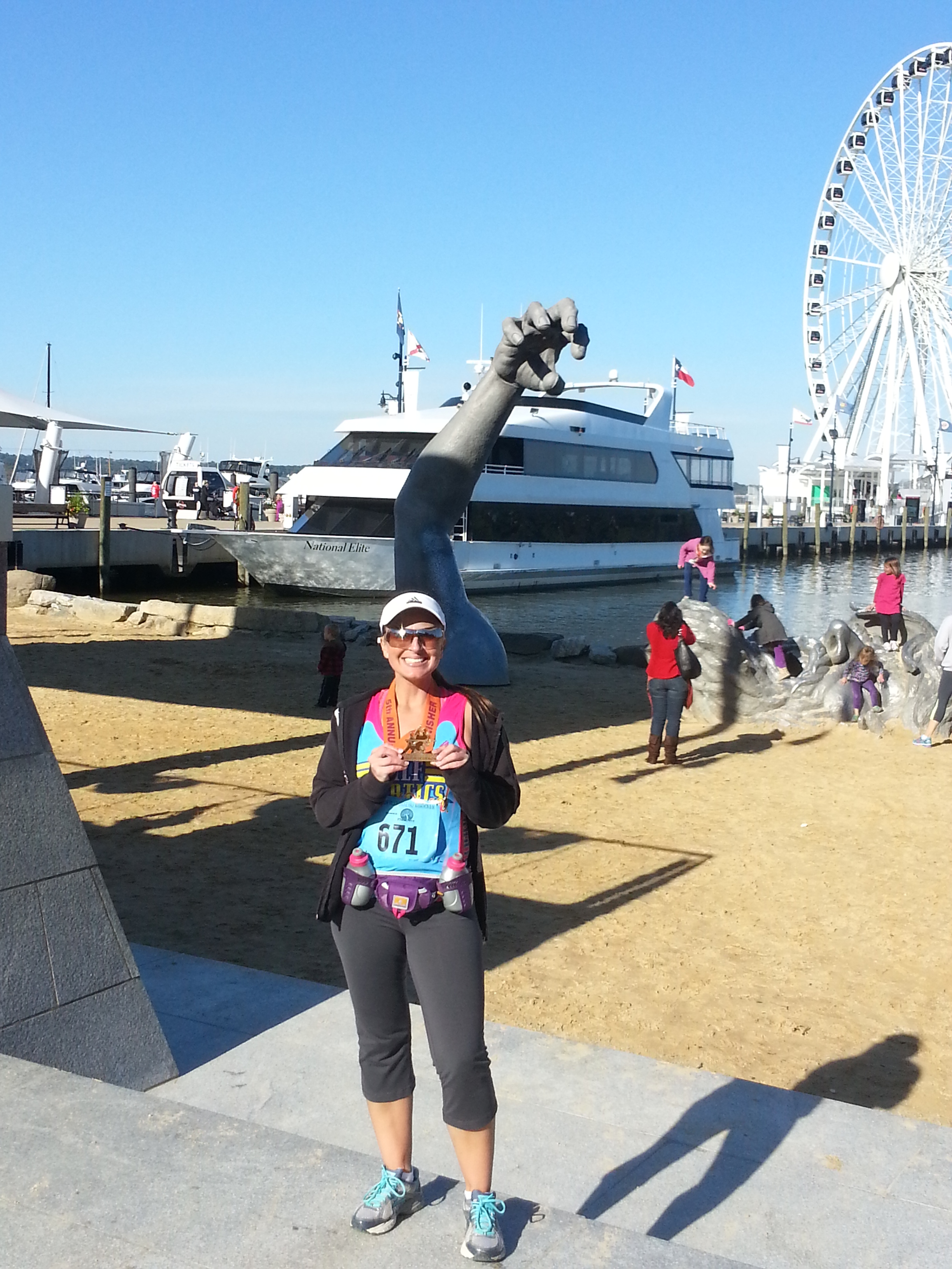 I am not typically a beer drinker, but there is something about a post-race beer that just feels right. I wasn’t able to drink it all, but had a few sips. There was a band playing in the celebration village and they sounded pretty good but we decided we better get down the road. We picked up my jacket that I had checked at the beginning of the race (the volunteers were wonderful and this was a breeze) and we headed to The Awakening Statue to take a couple of pictures in front of that and in front of the Woodrow Wilson Bridge (Again…looking so flat in the picture).